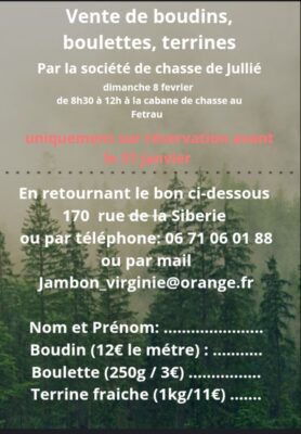 Catégorie: General Vente boudin boulette terrine Vente boudin boulette terrine 8 h 30 min – 12 h 00 min8 février 2026 iCal Calendrier Google Voir le calendrier complet